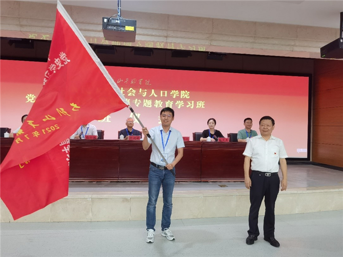 随后,林志成为培训班授旗,社会与人口公司教职工第一党支部书记、社会学系系主任朱斌作为学员代表上台接旗。