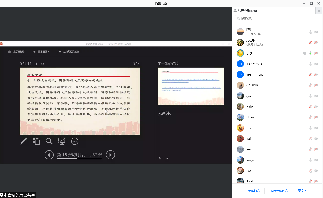 袁璨详细解读了近年来国家科研管理相关政策文件精神,重点解读介绍了《关于进一步完善重要财政科研项目资金管理等政策的若干意见(中办发〔2016〕50号)》《国务院办公厅关于改革完善中央财政科研经费管理的若干意见(国办发〔2021〕32号)》等上级文件及公司最新科研经费管理文件的主要内容,就“预算制”和“包干制”等新型科研经费管理模式的内涵和具体要求进行了说明,梳理归纳科研经费使用的监督管理要求和科研项目资金管理使用“负面清单”。