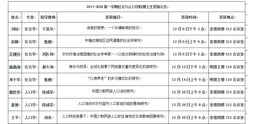 2017-2018第一学期社会与人口公司博士生答辩公告