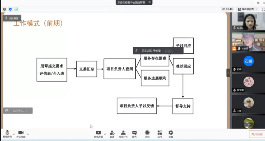 2022-01-27 文:bevictor1946韦德官网 图:bevictor1946韦德官网 2022年1月24日晚,2021级社会工作硕士党支部通过线上会议的方式召开了2021-2022年度秋季学期“心语”社工小组“朋辈支持 互助成长”项目总结会。社会工作与社会政策系祝玉红老师作为项目督导和19名参与本学期“心语”社工服务的党员与入党积极分子一同参会,本次总结会由2021级社会工作硕士党支部书记干怡雯主持。