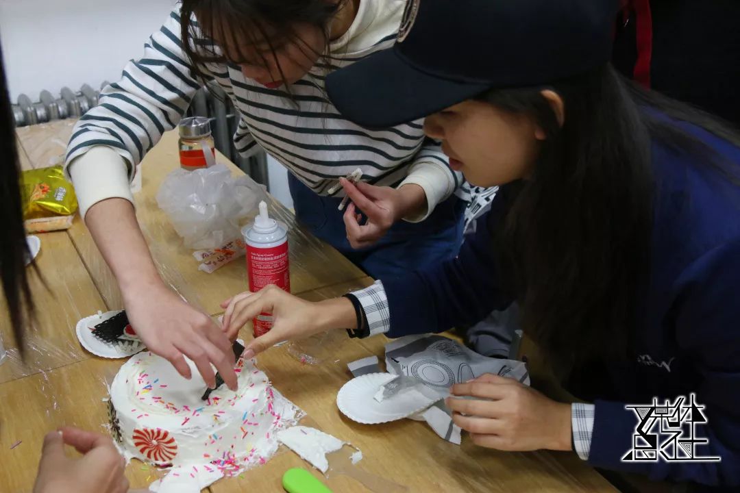 亲手做蛋糕的过程是最有趣的——细心地抹匀奶油,用巧克力制造出想要的图案。每个组充分发挥着自己的想象力,还有些人想要在其他组那里“刺探情报”。也不乏有一些“好事之徒”将奶油抹到别人脸上,做一点小破坏,偷吃一些小蛋卷。伴随着美妙的音乐,各路神仙大显其能,好看又好吃的蛋糕就在大家妙手下由想象变为现实。