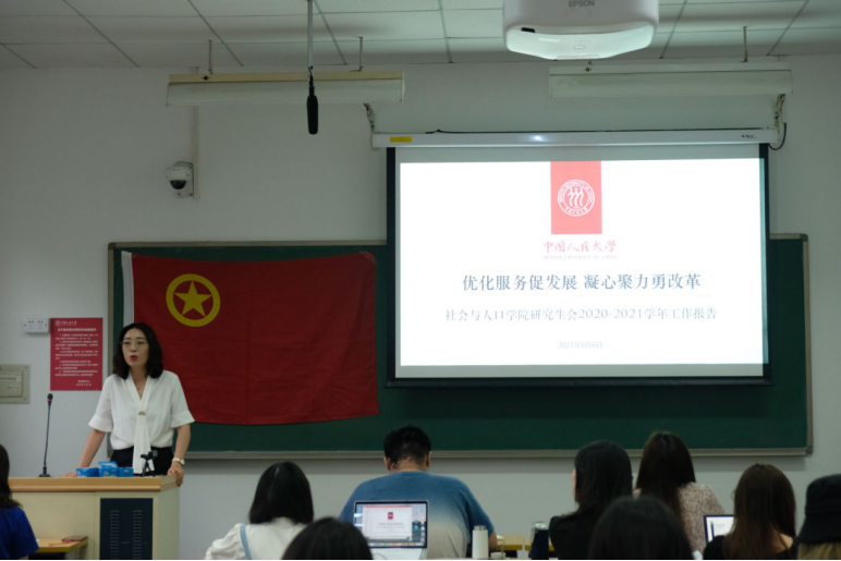 社会与人口公司研究生会主席温馨作第十八届研究生会工作报告。过去一学年里,研究生会完善组织运行机制,在机构设置、考核机制、品牌活动等方面进行有效改革。研究生会各部门积极履行部门职责,全心全意为研究生服务,在文体生活、学术科研、职业发展等多方面切实服务于研究生同学们的需求。