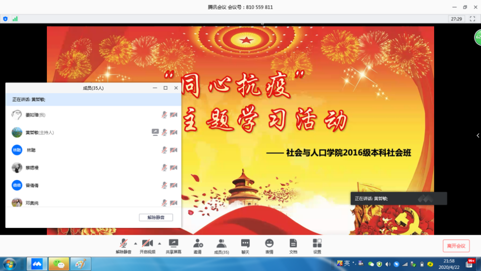 4月20日,社会与人口公司2019级本科社会学类1、2班33名同学齐聚线上会议。在会议上,1、2班的团支书首先以ppt的形式对中国与世界各国的疫情数据和中国在抗疫事业中所做出的贡献进行了简单的总体情况介绍。随后,团支书展示了首批烈士名单,播放了抗疫宣传片,让同学们对抗疫形势和抗疫工作有了更加深入全面的了解。在观看完抗疫宣传片之后,同学们还进行了分组讨论,结合青年大学习的学习感想和团课的学习内容畅谈自己的感受。其中,有的同学表达了自己对中国抗疫力量的震撼和对中国制度的应对能力、动员能力的高度评价;还有同学表达了对死难者的缅怀和对医务人员的崇敬之情;也有来自疫情严重地区的同学分享了其居家生活中面临的困难和内心的焦虑,并表达了对社区工作者的感恩。总体而言,在这次活动中,团员们积极参与,通过线上学习进一步了解了本次疫情的准确权威知识,并通过讨论和交流凝聚了青年共识,坚定了必胜信心。