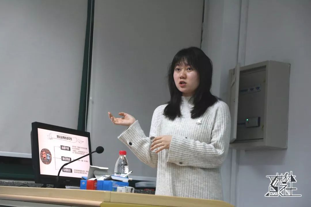 随后闫晓丹发言。她首先介绍了她的科研经历,又从选题、可视化程度和理论运用的适切性三个角度进一步说明了怎样使小创作品更具有吸引力和竞争力。她还在最后给出了几点小提示,希望同学们认真选择研究方法并处理好团队关系。