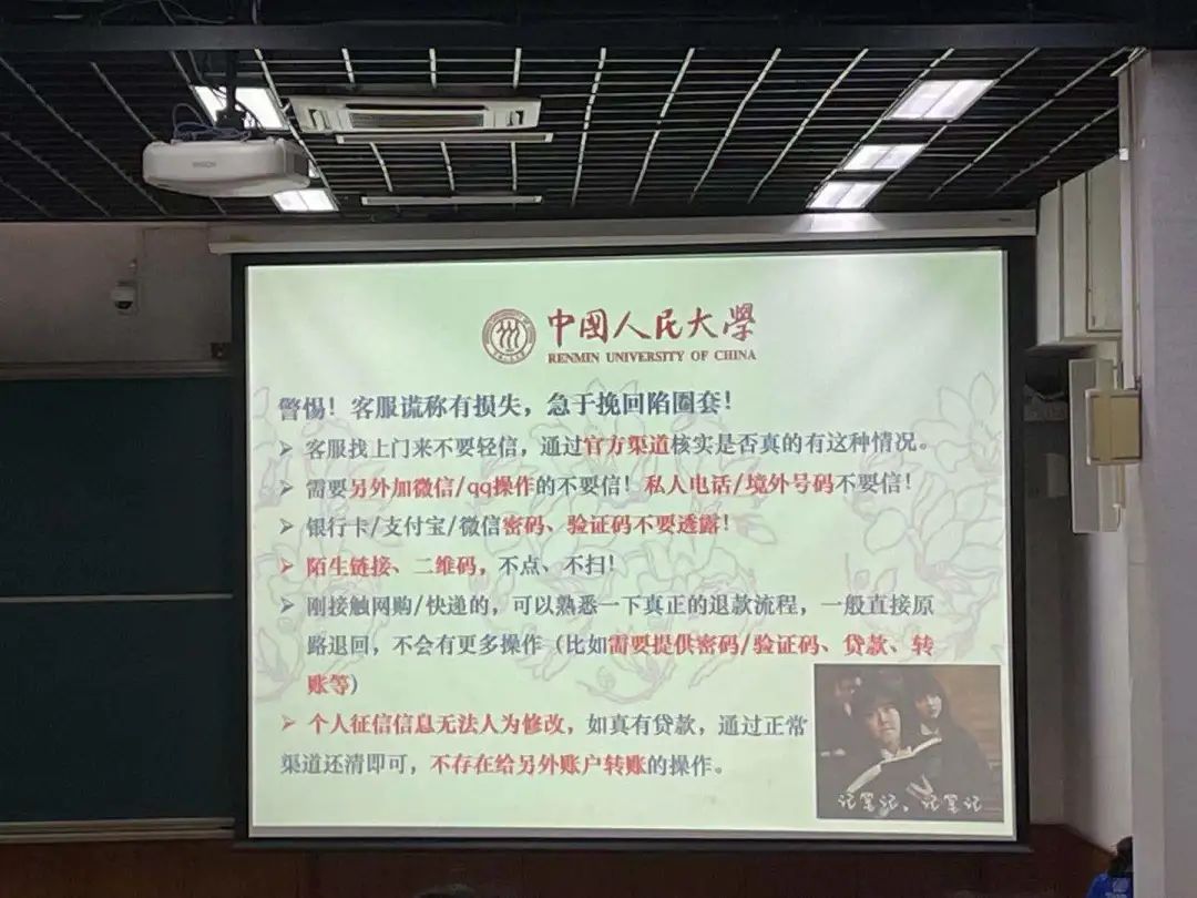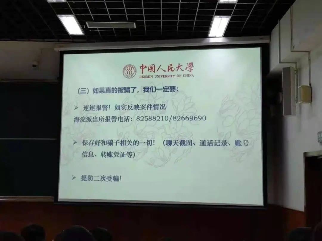 最后,李鲜老师建议下载“全民反诈”APP并叮嘱同学记下海淀区派出所电话、校园报警电话,以便在必要时保护自己,同时提醒大家被骗后要通过正规渠道寻求帮助以避免二次诈骗。
