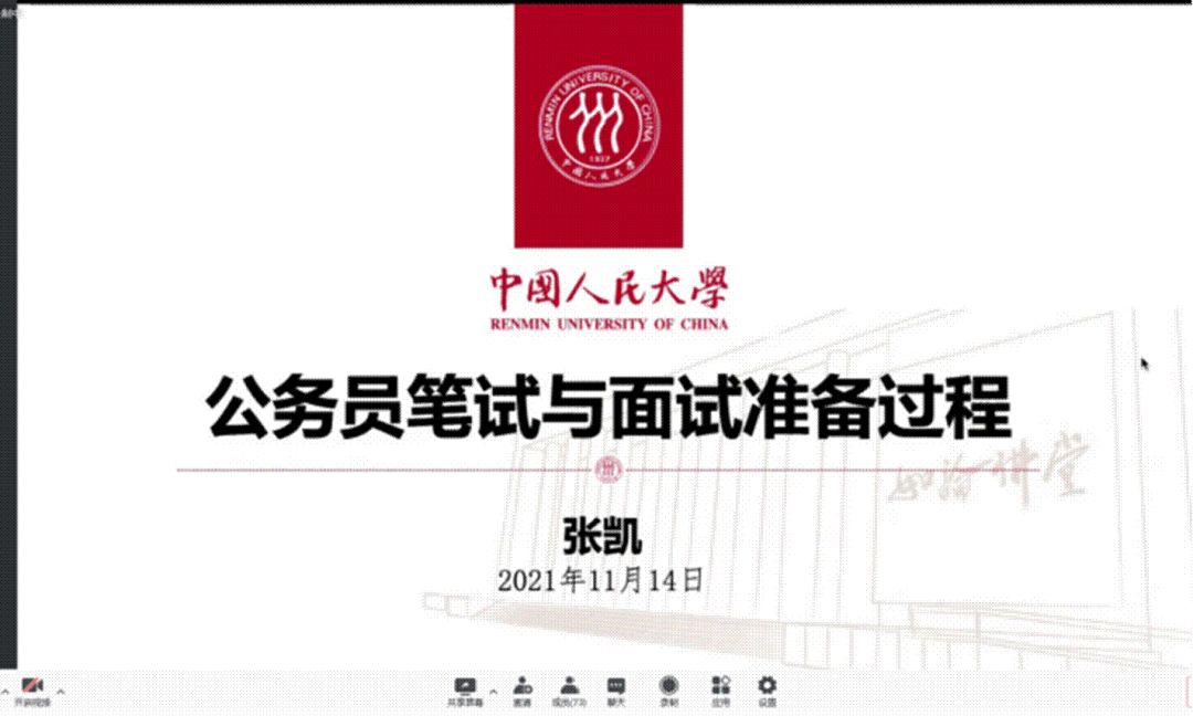 王一鹏师兄首先从考公的动机谈起,他强调精神动机的重要性,为国家、为人民服务的初心和使命是考公以及工作过程中最为重要的精神动力,需要大家不断地思考和拷问自己。随后,王师兄从横向、纵向两个方面为大家介绍了公务员的类别,总结了备考的注意事项,并结合个人工作感悟分享了自己对于公务员发展前景的看法。而后,王师兄还对参会同学在面试报班、参公事业单位以及基层工作的辛苦和实习经历等方面的问题进行了耐心解答。