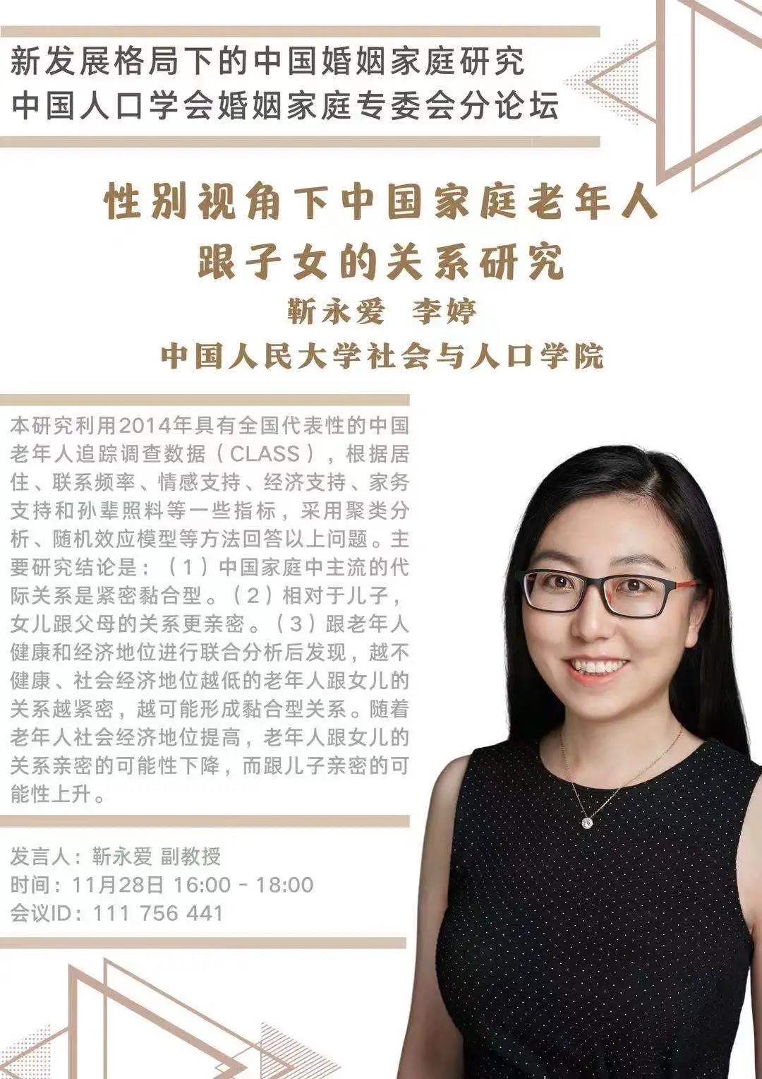 讲座预告 | 靳永爱:性别视角下中国家庭老年人跟子女的关系研究