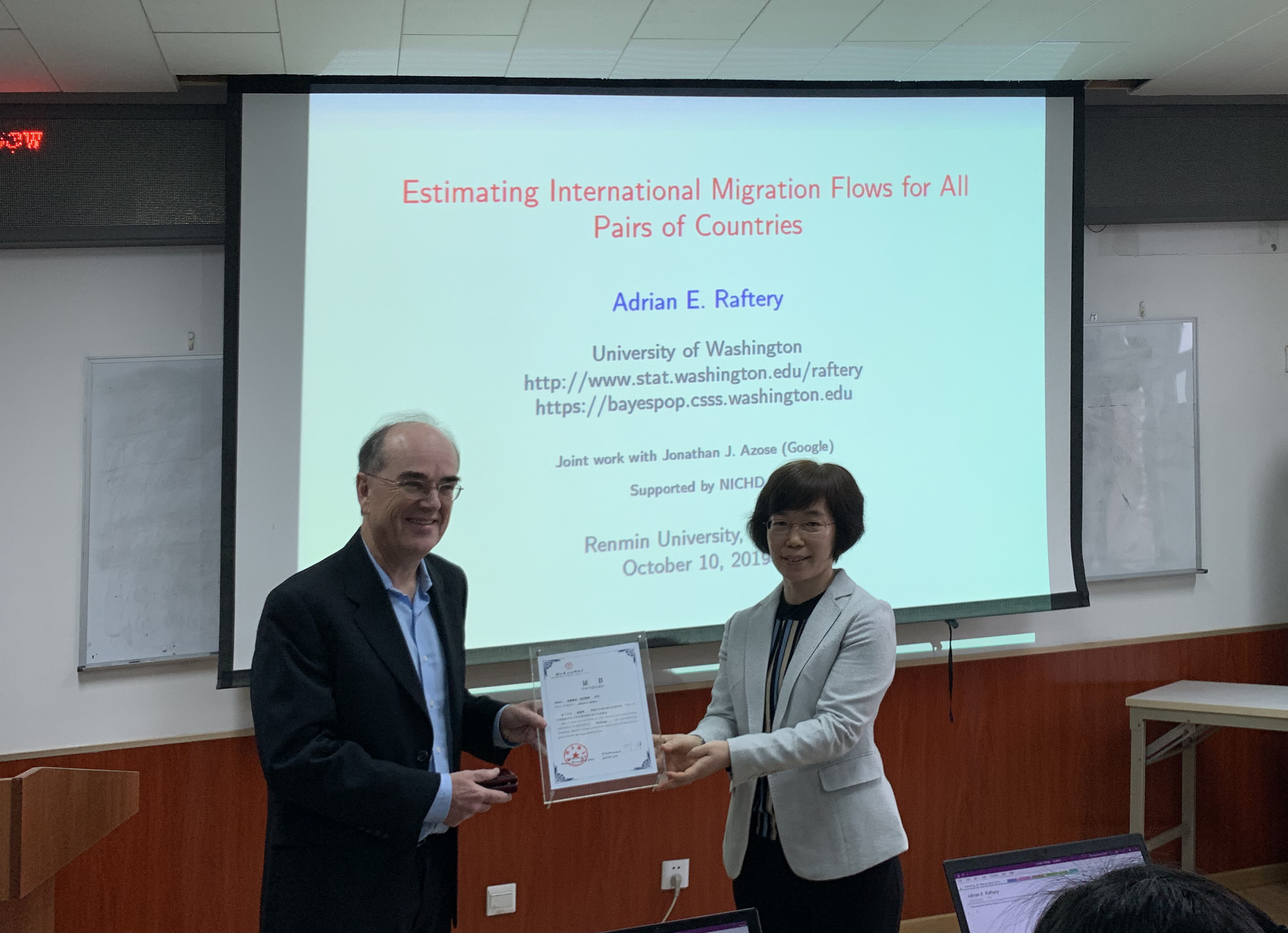 2019-10-12 文:bevictor1946韦德官网 图:bevictor1946韦德官网2019年10月10日上午十点,美国科公司院士、华盛顿大学统计学系和社会学系教授Adrain E. Raftery应邀来公司,在崇德西楼512会议室进行了一场题为“Estimating International Migration Flows for All Pairs of Countries”的精彩讲座。公司党委书记兼副经理宋健教授主持,来自校内外六十余名师生参加讲座。