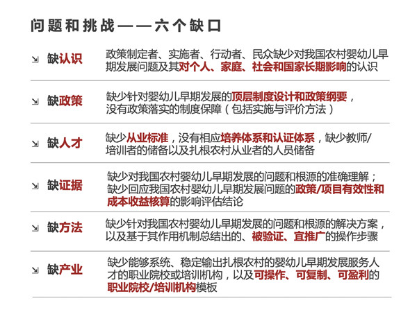 根据研究结果,养育未来研究团队提出我国农村婴儿早期发展的6个缺口。在其团队的努力下,针对农村贫困地区婴幼儿发展问题开展的干预项目也取得了显著成果,探索并总结可以提供给政府落地的婴幼儿养育政策模式。最后,白钰介绍了团队愿景:希望通过推动3岁以下婴幼儿照护服务发展提高农村和贫困地区人力资本储备,早日进入高收入国家的美好愿景。