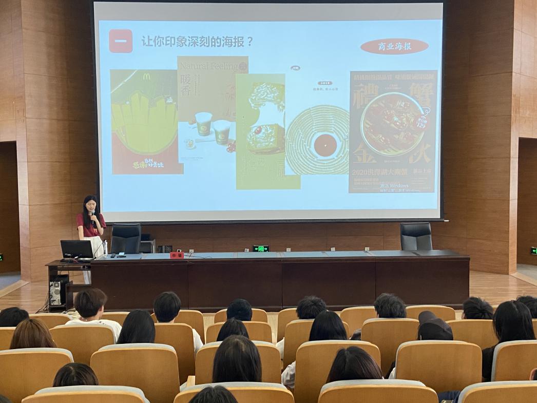 申馨为广告艺术设计专业的员工带来“指尖魔法:海报设计入门”课程,在带领同学们进行海报设计赏析后,鼓励、引导同学们动手实践、制作海报。