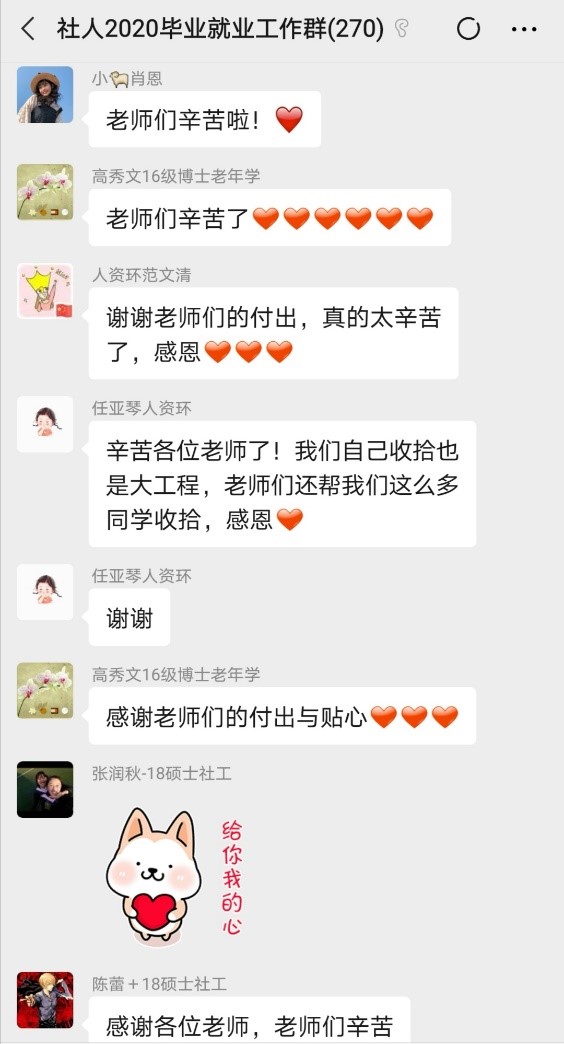 一个又一个行李打包的专属小群,一轮又一轮挥洒汗水的现场直播,一次又一次贴心的问候,真正实现了行李打包工作中的“一人一策”。毕业生们虽身处天南海北,但小小的镜头实现了他们与母校的云端相聚,尽力帮助他们圆满这特殊的毕业季的遗憾。毕业生们表示在云端相聚的短暂时光里,老师们都耐心细致、认真负责地为他们打包行李,镜头对面老师们反复确认、仔细寻觅物品的小细节也让他们倍感贴心。