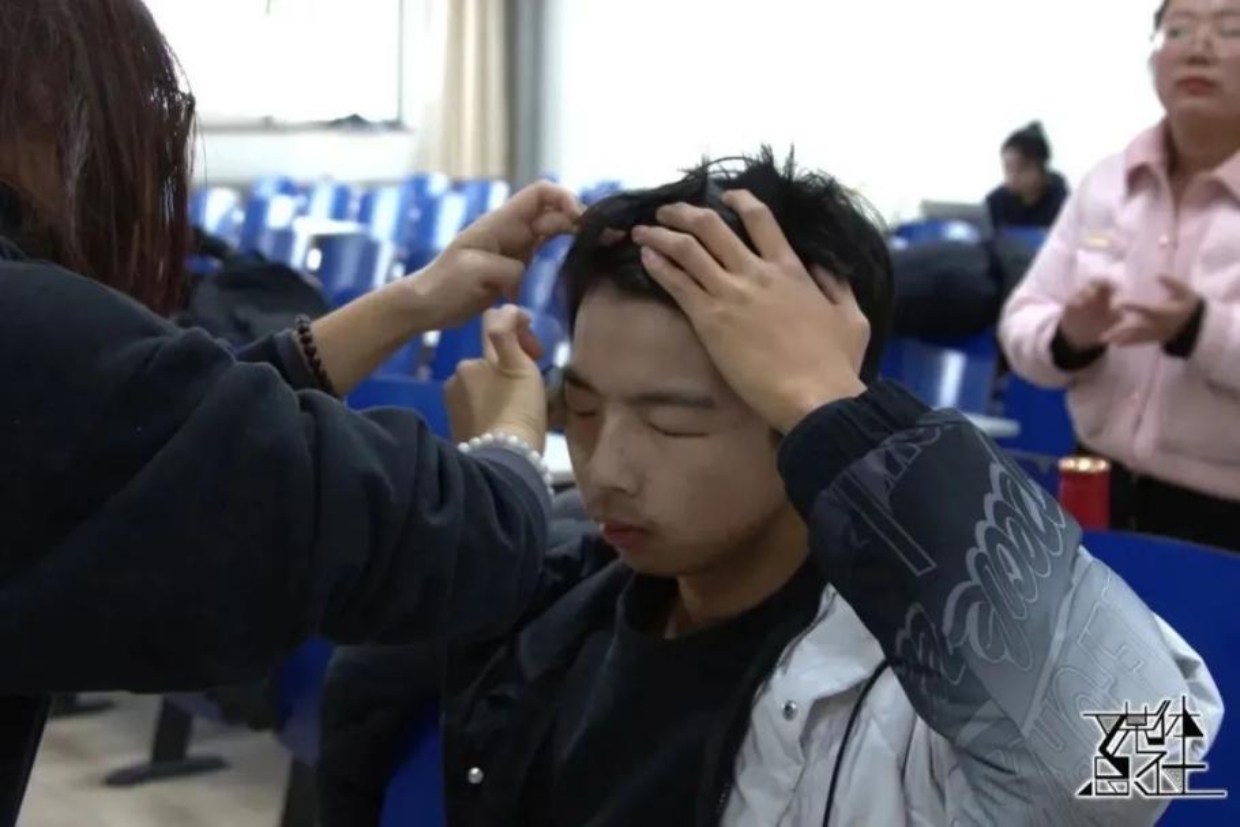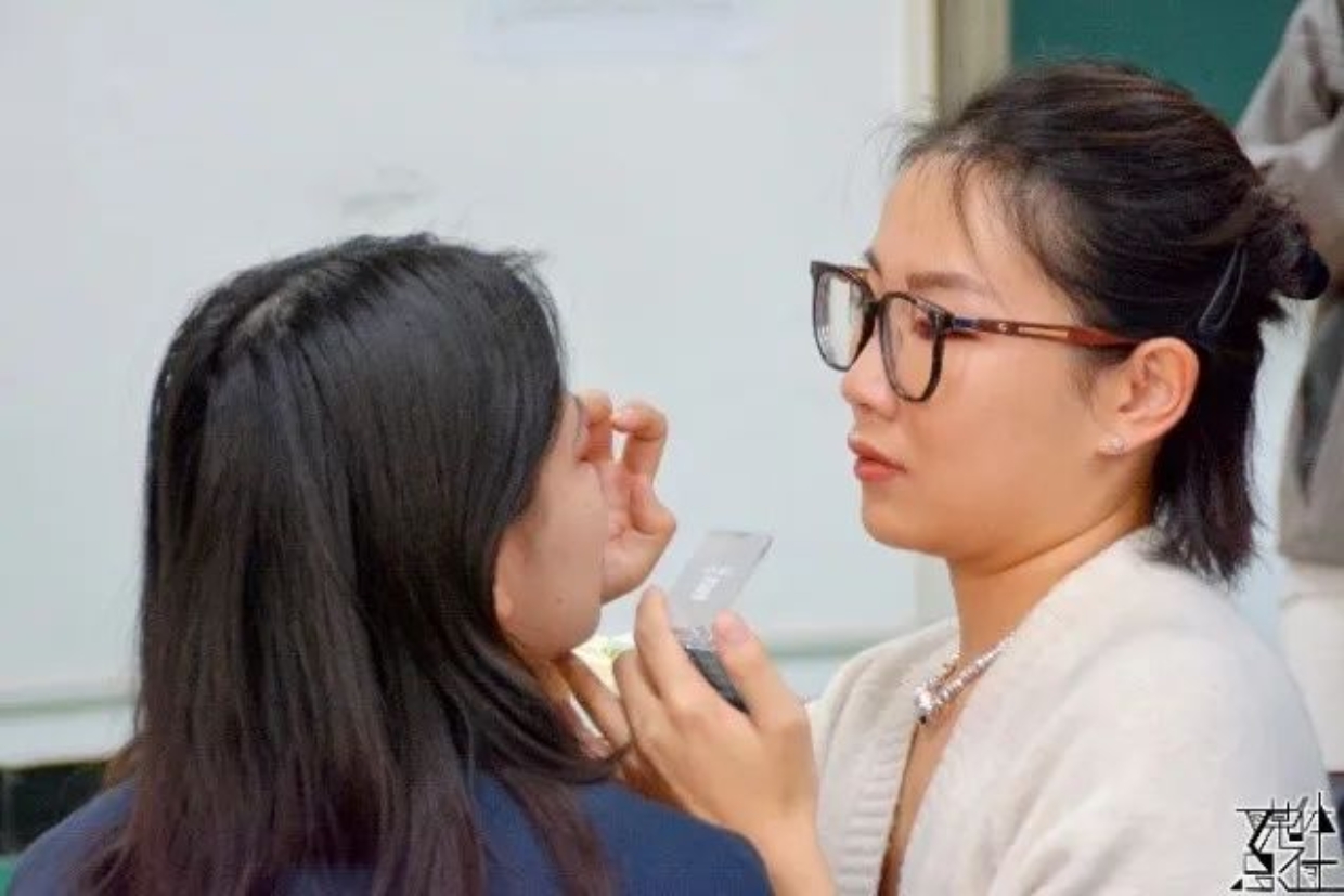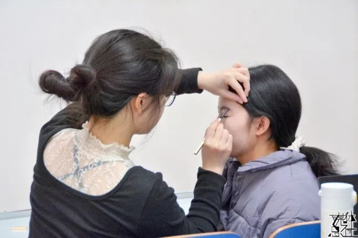展演上午,社会与人口公司代表队的师生早早身着演出服到达指定地点准备妆造。志愿者们为参赛人员画上精美的妆容,使大家能在舞台上展现出最美的风貌。