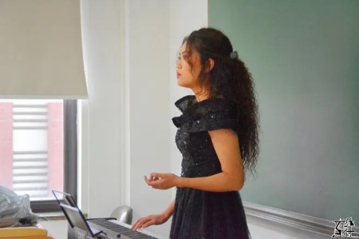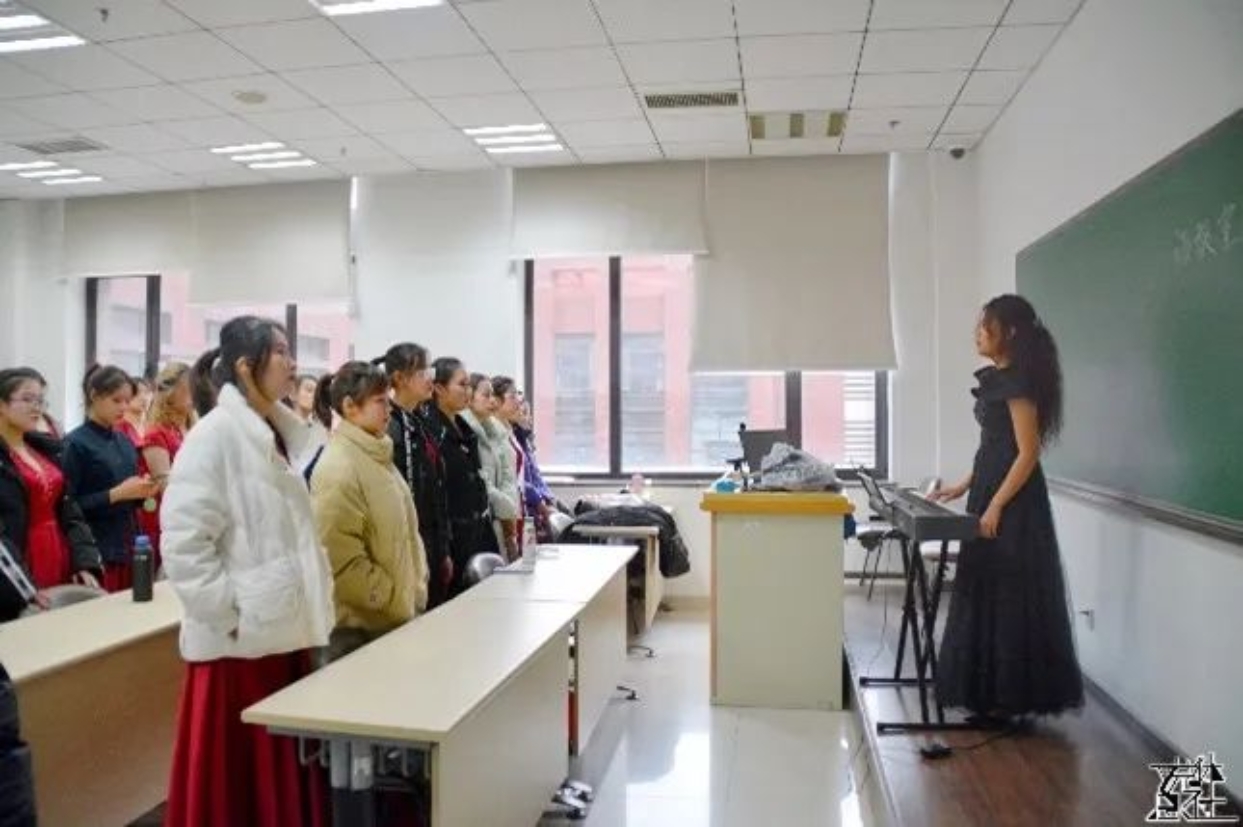 午饭后,在王馨仪同学的带领下,参赛师生在候场室里做参赛准备,进行正式比赛前的“开嗓”。
