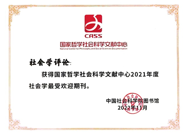 据悉,“2016—2021年最受欢迎期刊”系从全国约2000种中文哲学社会科学学术期刊中产生,以在线阅读量和下载量为基本统计指标计算关注度指数,最后关注度指数居前200名的期刊入选。“2021年度社会学最受欢迎期刊”则是全国 25 种社会学类期刊按同样算法计算后,关注度指数位居前三名的期刊。只有不到10年历史的《社会学评论》能够跻身前三,实属不易。公司三大期刊持续、同时入选“最受欢迎期刊”,显示公司在专业期刊方阵建设和“世界一流学科”建设方面取得显著成绩。