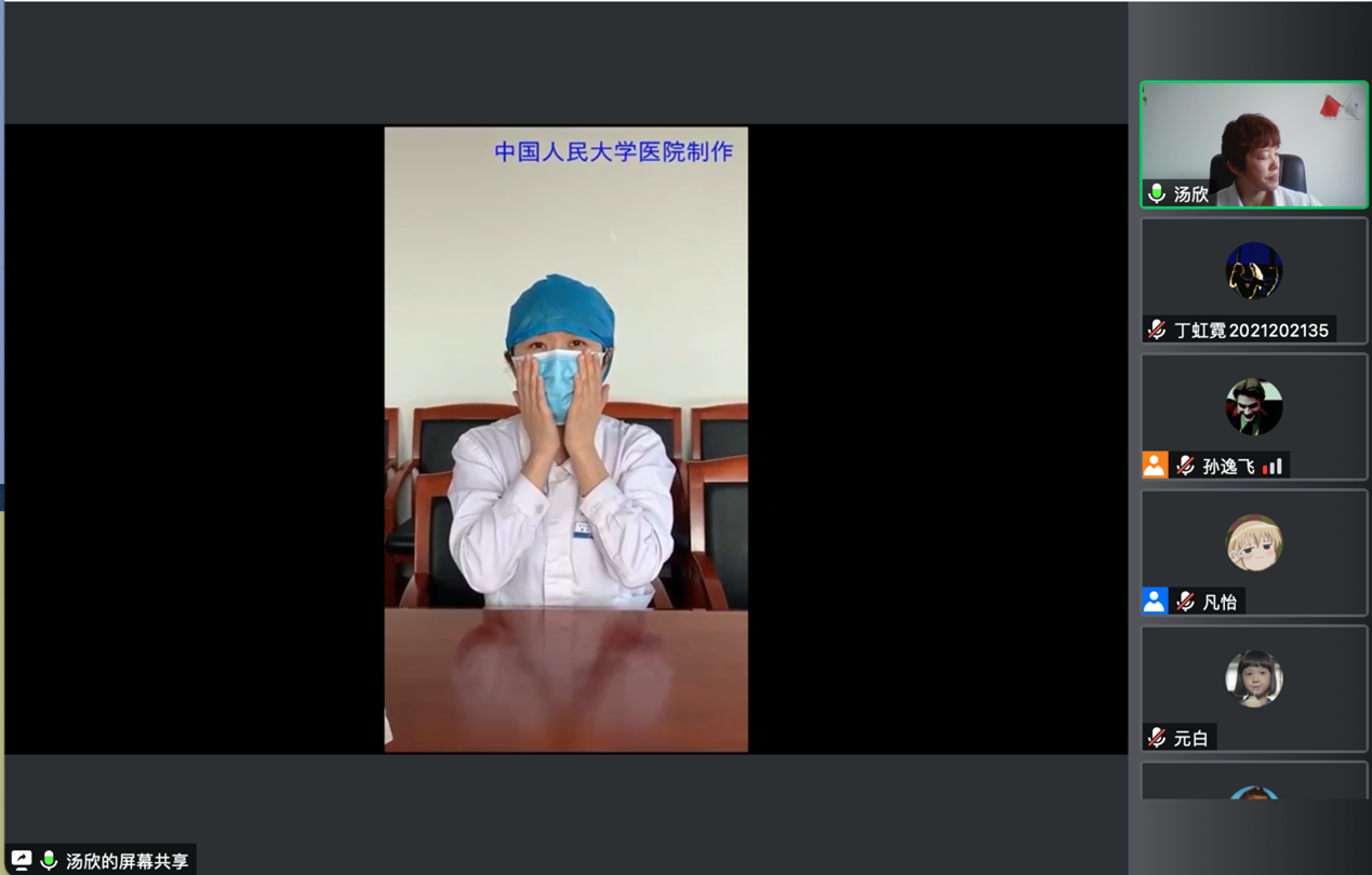 对于个人防护问题,汤欣副经理强调,由于新冠病毒的易感人群为所有人群,老师和同学们在日常生活中必须提高防控意识,做好个人防控:戴口罩、勤洗手、多通风、少聚集。同时,主动提高自身免疫力也是抵御疫情的基础环节,应当规律作息、适当运动、营养均衡、保持健康的心态。随后,汤欣副经理为全体师生播放了正确佩戴口罩以及七步洗手法教学视频,督促大家提高个人防控意识。